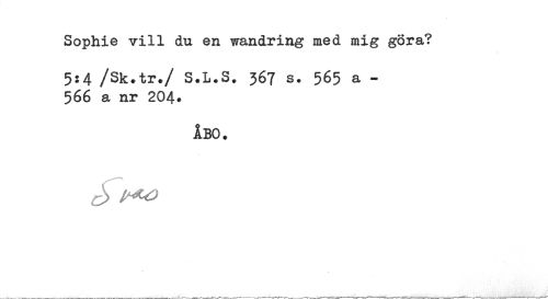 //// Sophie vill du en wandring med mig göra? //// 5:4 /Sk.tr./ S.L.S. 367 s. 565 a -566 a nr 204. //// ÅBO. //// £ l^LO ////