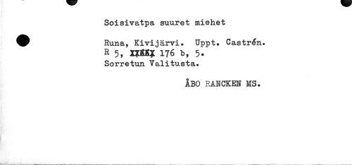 //// Soisivatpa suuret miehet ^^ Runa, Kivijärvi. Uppt. Castrén. //// H 5, 176 b, % //// Sorretun Valitusta. //// ÅBO RANCKEN MS. //// . r J ////
