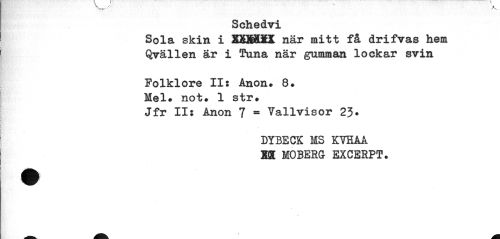 //// Schedvi //// Sola skin i XXMXI när mitt få drifvas hem Qvällen är i Tuna när gumman lockar svin //// Folklore II: Anon. 8. //// Mel* not. 1 str# //// Jfr II: Ånon 7 - Vallvisor 23 • //// DYBECK MS KVHAA m MOBERG EXCERPT. ////