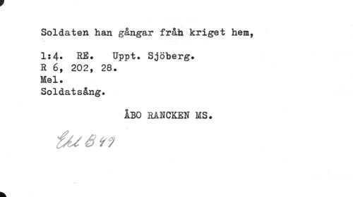 //// Soldaten han gångar fråh kriget hem, //// 1:4. RE. Uppt. Sjöberg. //// E 6, 202, 28. //// Mel. //// Soldatsång. //// ÅBO RANCKEN MS. //// \ //// t ////