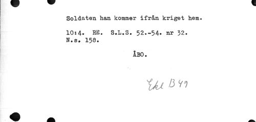 //// Soldaten han kommer ifrån kriget hem. //// 10:4. RE. S.L.S. 52.-54. nr 32. //// N.s. 158. //// ÅBO. //// Ut 5 ^ ////