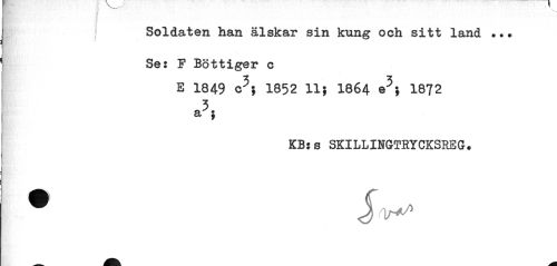 //// T //// I //// Soldaten han älskar sin kung och sitt land Se: F Bottiger c //// E 1849 c5; 1852 11; I864 e5} I872 //// 3 //// a : //// KB:s SKILLINGTRYCKSREG. ////