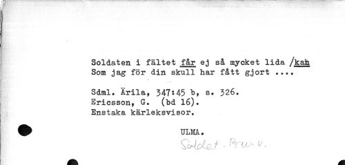 //// Soldaten i fältet får ej så mycket lida /kah Som jag för din skull har fått gjort ... //// ¦v //// Sdml. Ärila, 347*45 h, s. 326. //// Ericsson, G. //// (bd 16). Enstaka kärleksvisor. //// ^ ULM. ////
