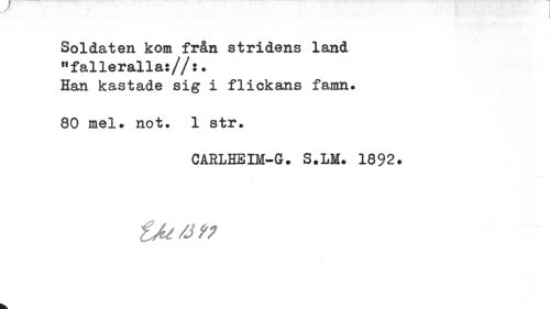 //// Soldaten kom från stridens land "falleralla://:. //// Han kastade sig i flickans famn. 80 mel. not. 1 str. //// CARLHEIM-G. S*LM. 1892* //// tAi/JtP ////