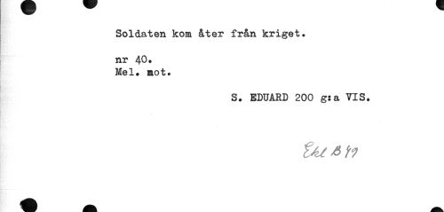 //// Soldaten kom åter från kriget. //// nr 40* Mel* mot* //// S* EDUARD 200 g:a VIS» //// tum ////
