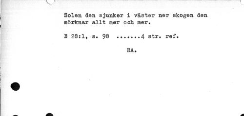//// Solen den sjunker i väster ner skogen den mörknar allt mer och mer. //// B 28:1, s. 98 ...4 str. ref. //// rå. ////