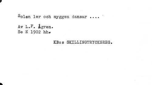 //// solen ler och myggen dansar ... //// Av L.F. Ågren. //// Se E 1902 hh» //// KB:s SKILLINGTRYCKSREG. ////