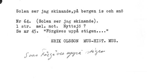 //// Solen ser jag skinande,på bergen is och snö //// Hr 64» (Solen ser jag skinande). //// 1 str. mel. not. Hyttsjö ? //// Se nr 45* "Förgäves uppå stigen..." //// ERIK OLSSON MUS-HIST. MUS. //// yr* //// 9- ////