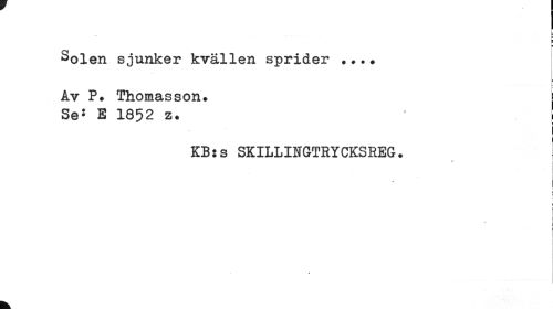 //// E //// ... u //// f //// u //// Solen sjunker kvällen sprider ... * //// Av P. Thomasson. I //// Se: E 1852 z. • //// KB: s SKILLINGTRYCKSREG. //// t //// i //// » j //// i ! //// i //// t //// ! //// « ////