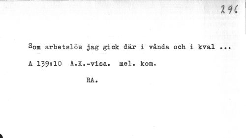 //// IU //// j //// Som arbetslös jag gick där i vånda och i kval ... A 139:10 A.K.-visa» mel. kom. //// RA. //// k ////