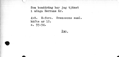 //// Som bonddräng har jag tjänat i många Herrans år. //// 4:8* H-fors. Svenssons saml. häfte nr 12. //// s. 93-94* //// ÅBO. ////