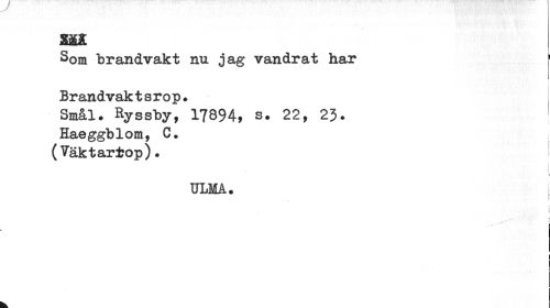 //// SM //// Som brandvakt nu jag vandrat har Brandvaktsrop. //// Smål. %ssby, 17894, b. 22, 23. Haeggblom, C. (Väktarrop). //// » //// ULMA. //// r //// r //// ! //// I //// k //// k ////