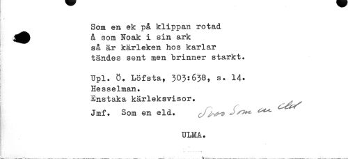 //// Som en ek på klippan rotad å som Noak i sin ark så är kärleken hos karlar tändes sent men brinner starkt* //// Upl. ö. Löfsta, 303s638, s• 14* Hesselman» //// Enstaka kärleksvisor. //// yf ^ > //// Jmf. Som en eld. Sst**- //// ULMA. //// =:• ... .. - ////