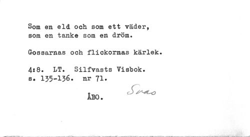 //// Som en eld och som ett väder, som en tanke som en dröm. //// Gossarnas och flickornas kärlek. //// 4:8. LT. Silfvasts Visbok, s* 135-136. nr 71. //// S //// ÅBO. ////