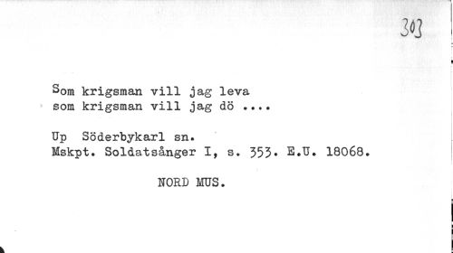 //// 3«] //// i //// k //// Som krigsman vill jag leva som krigsman vill jag dö ... //// Up Söderbykarl sn. //// Mskpt• Soldatsånger I, s. 353• E.Tf. 18068. //// NORD MUS. //// s ////