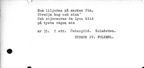 //// Som liljorna på marken fin, förnöja hog och sinn' Och stjernorna de lysa "blid på tysta vägen min //// nr 35. 2 str. Östergtld. Kolmården. //// DYBECK SV. FOLKMEL. ////