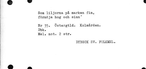 //// Som liljorna på marken fin, förnöja hog och sinn' //// Nr 35. Östergtld. Kolmården. Dbk. //// Mel# not. 2 str. //// DYBECK SV. FOLKMEL. ////