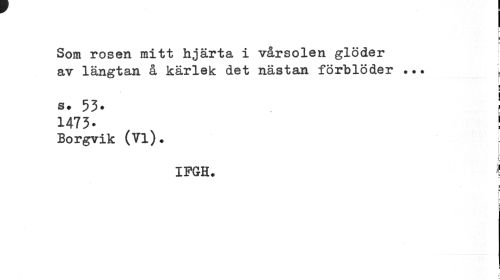 //// I //// I //// Som rosen mitt hjärta i vårsolen glöder //// av längtan å kärlek det nästan förblöder ... j //// i ¦ //// s. 53. ; //// 1473. ! //// Borgvik (Vi). //// t //// IFGH. k //// m //// s //// I //// j //// ¦ //// r ////