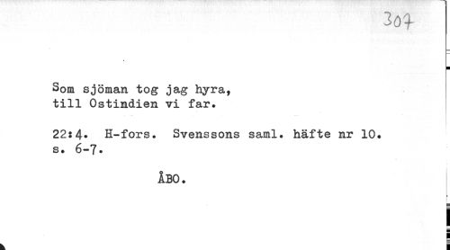 //// 3ö9- //// 9 //// Som sjöman tog jag hyra, till Ostindien vi far» //// 22:4« H-fors. Svenssons saml. häfte nr 10» s. 6-7» //// ÅBO. //// ! //// 1 ¦ ////