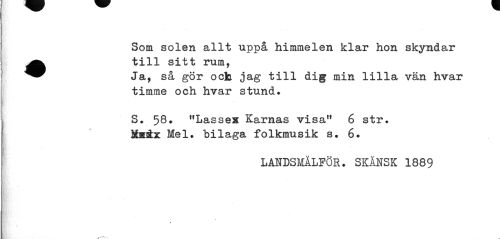//// Som solen allt uppå himmelen klar hon skyndar //// •till sitt rum, //// Ja, så gör och jag till dig min lilla vän hvar timme och hvar stund. //// S. 58» "Lassex Kärnas visa" 6 str. SKäx Mel. bilaga folkmusik s. 6. //// LANDSMåLFÖl. SKÅNSK 1889 ////