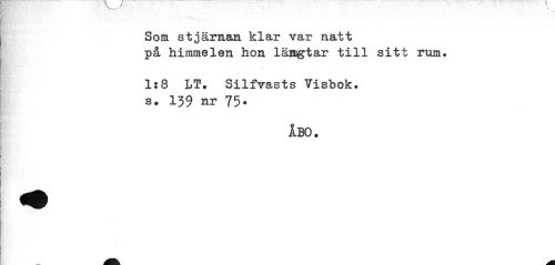 //// Som stjärnas, klar var natt på himmelen hon längtar till sitt rum. //// 1:8 LT. Silfvasts Visbok. //// s. 139 nr 75* //// ÅBO. ////