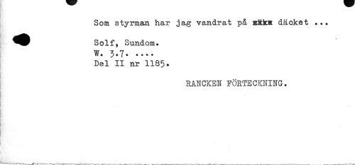 //// Som styrman har jag vandrat på xäkm däcket //// ^^ Solf, Sundom. //// ¥• 3 ? 7 ? //// Del II nr 1185. //// RANCKEN FÖRTECKNING» ////