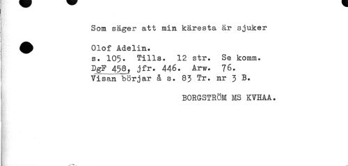 //// Som säger att min käresta är sjuker //// ^ Olof Adelin. //// s. 105. Tills. 12 str. Se komm. //// DgP 458, jfr. 446. Arw. 76. //// Visan börjar å s. 85 Tr. nr 3 B. //// BORGSTRÖM MS KVEAA. ////