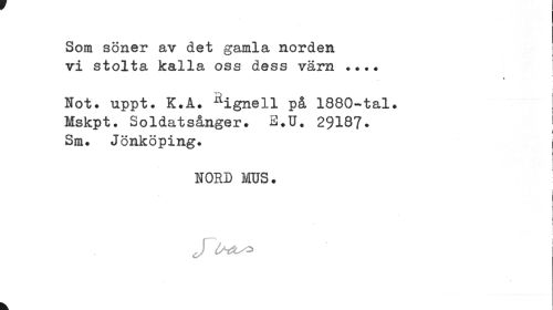 //// Som söner av det gamla norden vi stolta kalla oss dess värn ... //// % //// Not. uppt. K.A. ^ignell på 1880-tal. ! //// Mskpt. Soldatsånger. E.U. 29187- | //// Sm. Jönköping. //// I //// NORD MUS. : //// J //// k ////