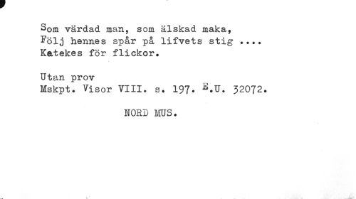 //// Som värdad man, som älskad maka, ^ölj hennes spår på lifvets stig ... Katekes för flickor. //// Utan prov //// Mskpt. Visor VIII. s. 197. J2072. //// NOHD MUS. ////