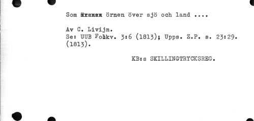 //// Som äraHSH örnen över sjö och land ... Av C. Livijn. //// Ses UUB Folkv. 3$6 (1813); TJpps. Z.P. s. 23$29. //// (1813). //// KB s s SKILLINGTRYCKSREG. ////