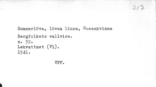 //// 0/7 //// v //// i //// ! //// \ //// j //// Sommerlöva, löven linna, senkvinna //// i //// Bergfolkets vallvisa. | //// s. 32. //// Lekvattnet (Vi). //// 1541. //// VFF. //// i ////