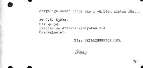 //// Sorgeliga saker hända här i världen nästan jämt.. Av G.S. Sjöbo. //// # //// Se: Qc 54. //// Handlar om drunkningsolyckan vid Övedskloster. //// KB:s SKILLINGRRYCKSREG. //// % n .. //// v / ////