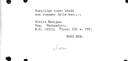 //// Sorgeliga saker hända som romaner fylla kan.•.. //// Elvira Madigan. //// Vsm. Västanfors. //// E.U. 20310. Visor. III s. 787» //// NORD MUS. //// cJ ////