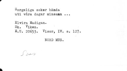 //// ^orgeliga saker hända uti våra dagar minsann ... //// Elvira Madigan. //// Sk. Viken. //// E.U. 20653. Visor, IV. s. 127. //// NORD MUS. //// J //// k ////