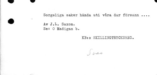 //// Sorgeliga saker hända uti våra dar försann ... //// ^^ Av J.L, Saxon. //// Se: 0 Madigan b. //// KB: s SKILLINGTRYCKSREG. //// J ly^ö ////