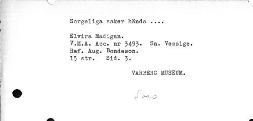 //// Sorgeliga saker hända ... Elvira Madigan. //// V#M.A. Acc. nr 3493» Sa. Vessige. Ref. Aug. Bondeson. //// 15 str. Sid. 3. //// VARBERG MUSEUM. ////