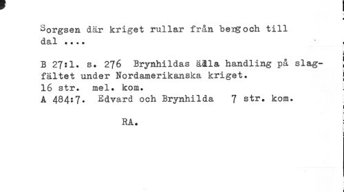 //// I //// Sorgsen där kriget rullar från beigoch till //// dal + +»# i //// i //// B 27:1. s. 276 Brynhildas ädla handling på slag- | fältet under Nordamerikanska kriget. j //// 16 str. mel. kom. //// A 484:7. Edvard och Brynhilda 7 str. kom. //// 1 //// RA. //// ¦ //// 1 ////