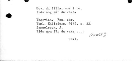 //// Sov, du lilla, sov i ro, tids nog får du vaka» //// Taggvisa» Fon. skr. //// Vsml» Hällefors, 9139, s» 22. //// Samuelsson, J. //// Tids nog får du vaka ..•? //// ULMA. ////