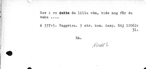 //// Sov i ro abdtiat du lilla vän, tids nog får du vaka .•.• //// A 337•5• Vaggvisa. 3 str. kom. insp. Rtj 12062: //// 31. //// RÅ. //// /(/aut/t ////