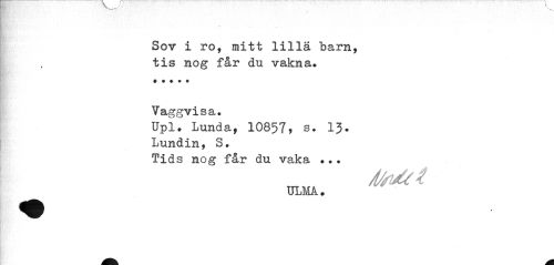 //// Sov i ro, mitt lilla barn, tis nog får du vakna. //// Vaggvisa. //// Upl. Lunda, 10857, s. 13. Lundin, S. //// Tids nog får du vaka ... //// ULMÅ . ////