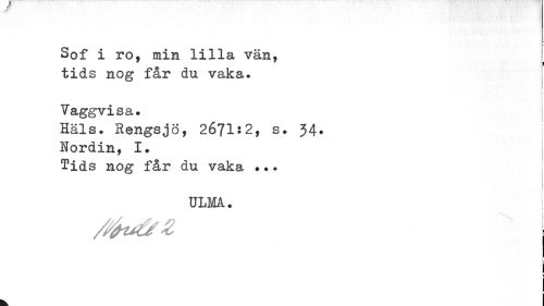 //// Sof i ro, min lilla vän, tids nog får du vaka. //// i //// - //// Vaggvisa. //// Hals. Rengsjö, 2671:2, s. 54. j //// Nordin, I. //// Tids nog får du vaka ... //// ] //// ULMA. //// f i ////