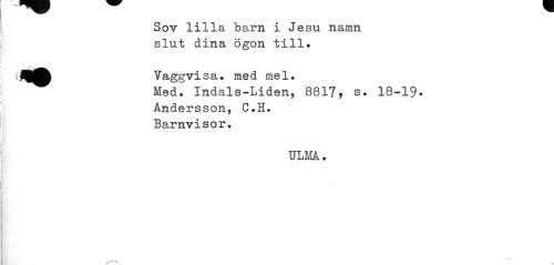 //// Sov lilla barn i Jesu namn slut dina ögon till. //// Vaggvisa, med mel. //// Med. Indals-Liden, 8817, s. 18-19- //// Andersson, C.H. Barnvisor. //// ULM. ////