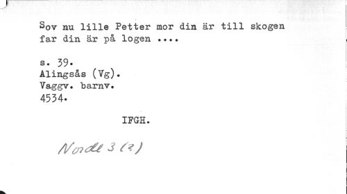 //// I //// S0v nu lille Petter mor din är till skogen far din är på logen . ?. ? //// S. 39- //// Alingsås (Vg). Vaggv. barnv. //// 4534. //// IPGH. ////