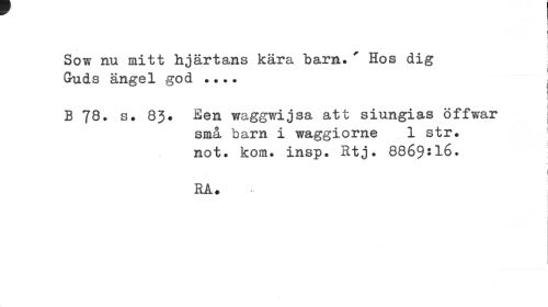 //// I //// ! //// i j //// * i //// Sow nu mitt hjärtans kära barn. ' Hos dig //// i //// Guds ängel god ... ! //// B 78» s. 83. Ben waggwijsa att siungias öffwar | //// små barn i waggiorne 1 str. ! //// not. kom. insp. Rtj. 8869516. //// RA. //// i j //// i ////