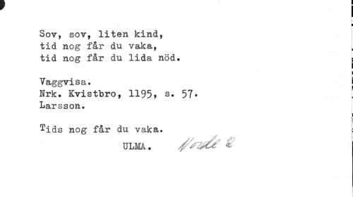 //// I //// Sov, sov, liten kind, tid nog får du vaka, //// tid nog får du lida nöd. : //// Vaggvisa» i //// Nrk* Kvistbro, 1195, s. 57* ! //// f //// Larsson. //// Tids nog får du vaka. //// ULM. ////