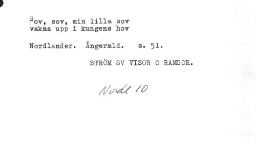 //// °ov9 sov, min lilla sov vakna upp i kungens hov //// Nordlander. Angermld. s. 51* //// STRÖM SV VISOR 0 RAMSOR. //// A/Ms se ////