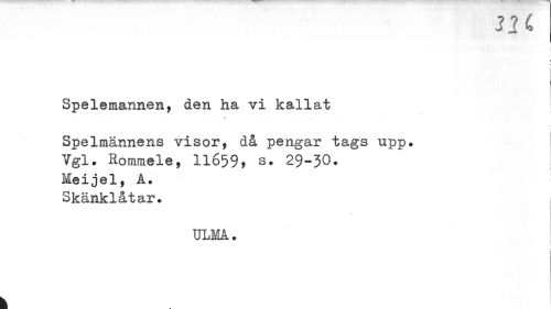 //// JK //// i \ //// Spelemannen, den ha vi kallat //// , ^ ... , ... //// : //// Spelmännens visor, då pengar tags upp. //// Vgl. Rommele, 11659, s. 29-30. | //// Meijel, A. //// Skänklåtar. //// ULMA. //// i i ////