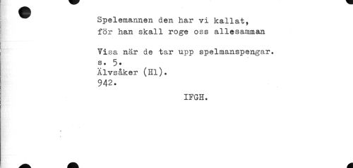 //// Spelemannen den har vi kallat, för han skall roge oss allesamman //// Visa när de tar upp spelmanspengar. //// s. 5. //// Älvsåker (Hl). //// 942. //// IFGH. //// t //// ^ A A ////