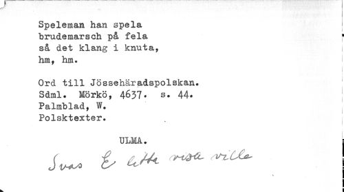 //// Speleman han spela i //// brudemarsch på fela //// så det klang i knuta, j //// hm f hm. //// I //// Ord till Jössehäradspolskan. Sdml. Mörkö, 4637* s. 44* //// Palmblad, W. Polsktexter. //// * //// ULMA. i //// Jf, ej*. ^^ ! //// \ ////