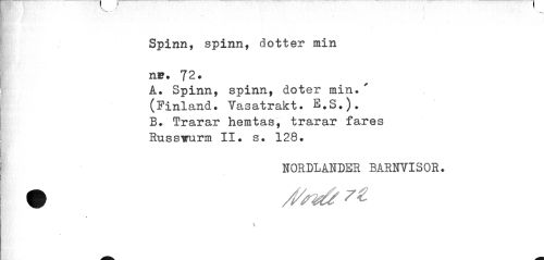//// 1 -•• ^ //// Spinn, spinn, dotter min //// ¦ //// n*. 72. //// A. Spinn, spinn, doter min.' (Finland. Tasatrakt. E.S.). //// B. Trarar hemtas, trarar fares Hussmtrm II. s. 128. //// NORDLANDER BARNVISOR. //// \ ////